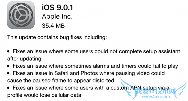 现在用户们可以通过设置应用程序中的软件更新,获得最新的 iOS 9.0.1 系统下载,或者也可以通过 iTunes 进行升级。本次更新主要包含了对一些 bug 内容的修复,从更新描述中我们可以看到,包括有: