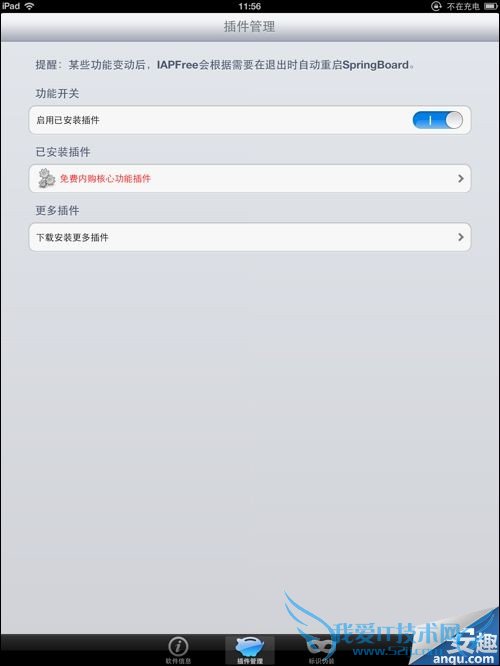 第二步:当你桌面出现iAPFree这个图标后,启动它,选择插件管理,将启用已安装插件设为开启状态,然后选择‘下载安装更多插件’,将免费内购核心功能插件下载安装上去。