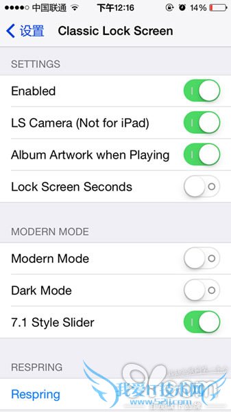 iOS 7 的锁屏风格很好看?但 iOS 6 的也很经典,那么该如何取舍?能不能将他们混在一起?ClassicLockScreen 告诉你是可以做到的。它也可以帮助你将 iOS7 锁屏界面替换为 iOS6 样式。这款插件为你提供了 4 款锁屏的样式。分别是经典模式,现代模式,深色模式,和7.1滑动条风格(和 iOS 7.1.x 关机界面的滑动条风格类似)。安装这款插件后,经典模式是默认的风格。