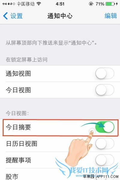 第二步,在定位服务中,开启“天气”选项功能。 第三步,在“设置”应用中,“通知中心”选项页面,点击开启“今日摘要”。