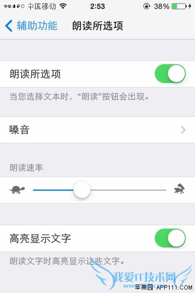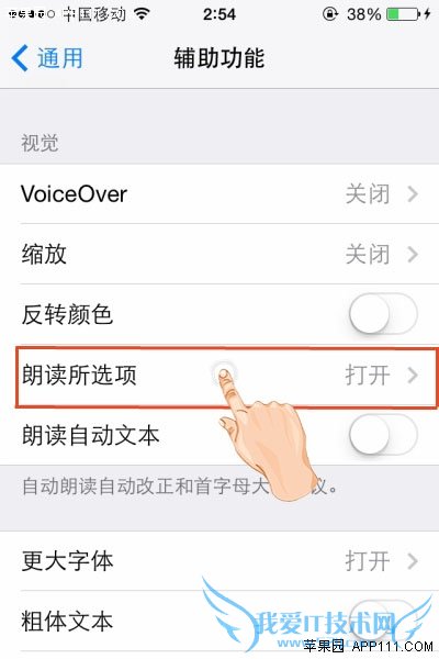 第二步,在“辅助功能”页面中,进入“朗读所选项”,开启“朗读所选项”功能,并选择一个合适的朗读速度。