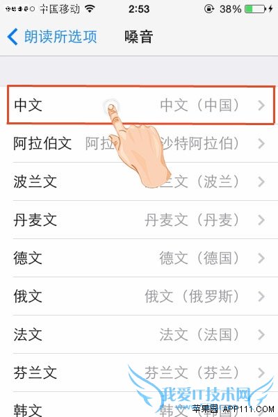 第三步,用户还可以选择朗读的语言,只需要点击嗓音,然后选择朗读的语言。