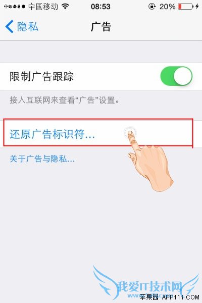 第三步,在“广告”设置页面,点击“还原广告标识符”,即可。
