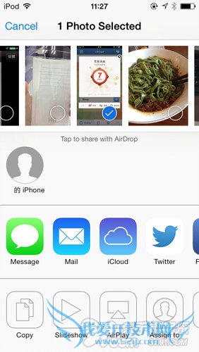开启AirDrop后,进入到照片、联系人等相关项目,点击“共享”,系统便会自动搜寻附近已开启AirDrop的用户,选择联系人,配对完毕后即可传输文件,速度很快。