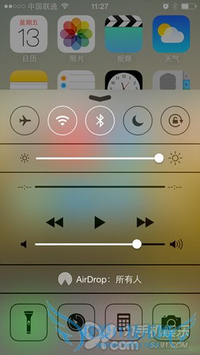 AirDrop被集成在控制中心里,在任何点亮屏幕的情况下,从屏幕底部向上拉激活控制中心,点击AriDrop即可开启。