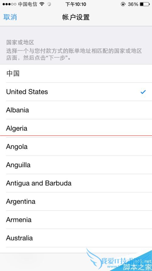 5、这里以选择美国为例(选择一个支持Apple Music服务的国家或地区即可);