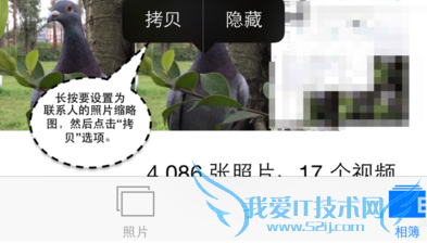 2、接下来请选择好要设置为联系人的头像,用手指长按此照片的缩略图,然后点击“拷贝”选项。