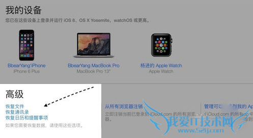3、接下来在 iCloud 的设置页面左下方,有一个“高级”栏目,在下面有一些恢复选项,如图所示