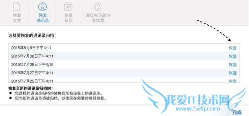 4、这里以恢复 iCloud 上的通讯录为例,可以看到系统会自动为我们列出之前做过操作的一些归档记录。选择想要回退的日期,点击右侧的“恢复”就可以恢复了。