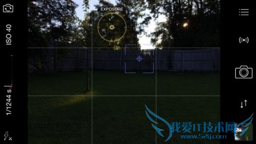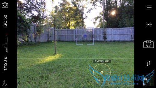 ProCamera 7中,默认情况下,对焦、曝光会以“十字准线”形式出现在一起。通过把你的手指放在这两个“准线”中,拖动,把曝光点(圆圈)和焦点(正方形)分开,然后可以分别进行单独的设置了。双击屏幕就可以把它们都恢复到屏幕中心。