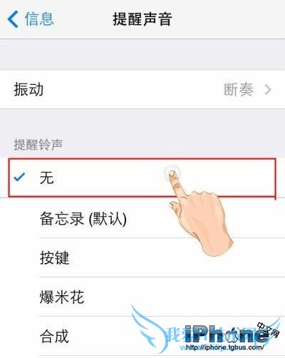 第四步,在我们进入到“提醒声音” 就可以点击“无”,即这样信息就设置为了“静音”模式 有消息就不会提醒了,只会静音了。