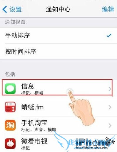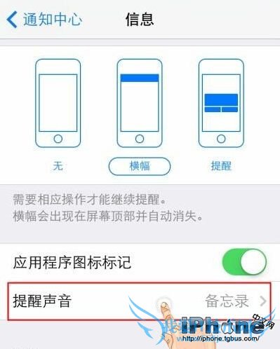 第三步,如果我们要设置那个程序静音,我们只需要进入某个应用程序(例如信息),就可以进行“提醒声音”、“在通知中心显示”、“在锁屏上显示”等设置。