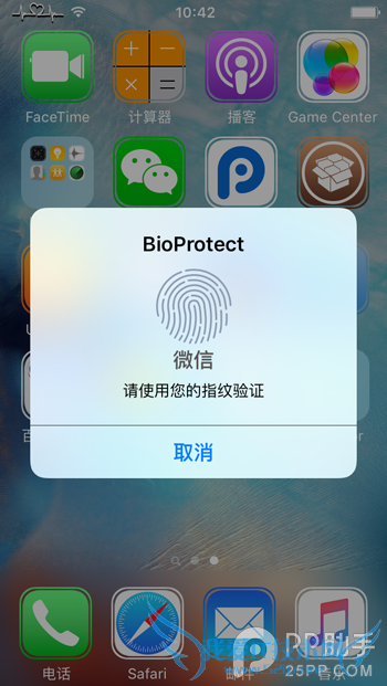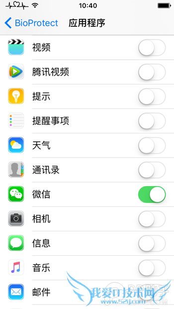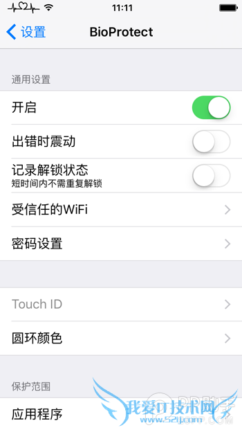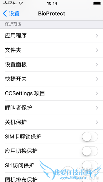 3、BioProtect保护范围:BioProtect支持为应用程序、文件夹、设置面板中的功能以及开关机、SIM卡解锁、应用程序切换、Siri以及图标排布保护等。具体设置方法(以为应用加密为例):打开BioProtect,点开【应用程序】,勾选所要加密的应用程序,返回桌面之后,打开相应的应用则需要验证指纹。