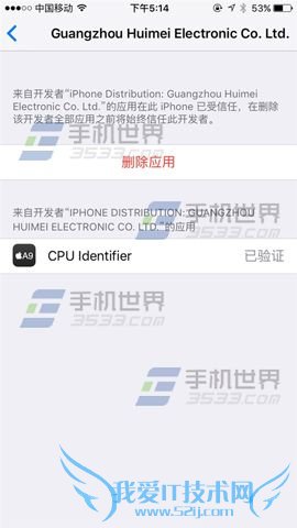 3)描述文件中选择【Guangzhou Huimei Elec...】,再点击【信任】,用完之后点击【删除应用】即可。(如下图)