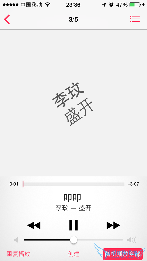 设置完成后再打开“音乐”APP,进入曲目播放界面后想要随机切换播放,只要晃动一下手机即可。