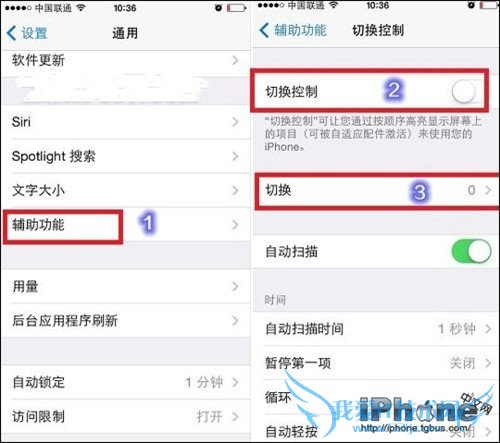 2、进入通用设置后,我们再进入“辅助功能”设置,之后在进入“切换控制”设置。然后先开启切换控制功能,之后再点击进入具体的切换功能选择设置,如下图所示: