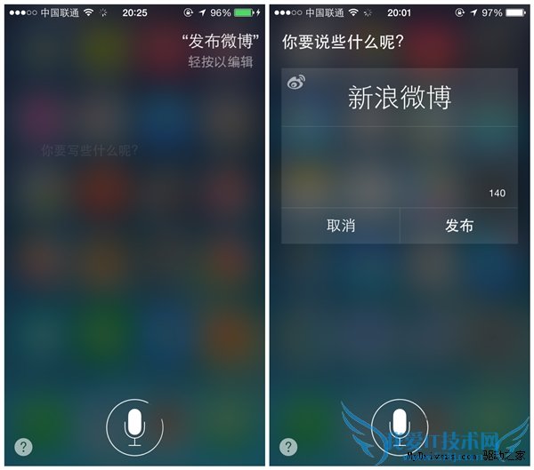 第四步:此时,已经在iPhone手机上成功绑定微博账号,接下来长按Home键开启Siri语音助手,并对着Siri说“发布微博”,Siri就会识别显示“发布微博”。