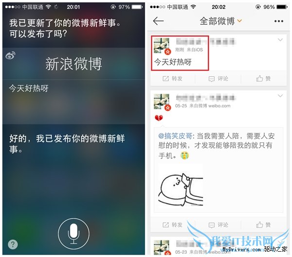 第五步:等待1秒之后,Siri会弹出微博撰写界面,这时直接说出需要发布的微博内容,如“今天好热呀”。