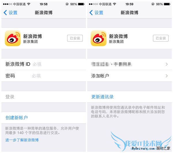 第三步:选择“添加账户”,之后输入自己的新浪微博账户和密码,并通过验证登录。