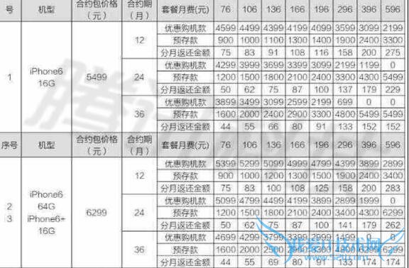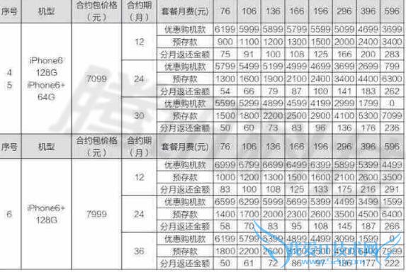 目前,外界普遍认为购买意向较高的64G版iPhone6及iPhone6 Plus,分别只要预存6299元,选择24个月合约的596元套餐,或预存7099元,选择30个月合约的596元套餐,即可0元购机。