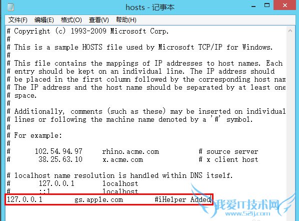 2.用记事本或写字板打开hosts文件,在最下面有一行“127.0.0.1 gs.apple.com #iHelper Added”删除这行即可。