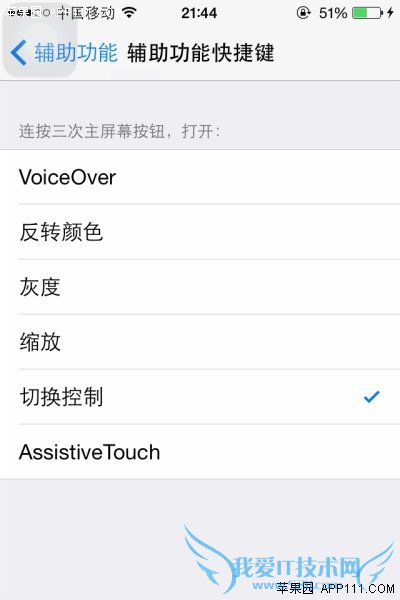 一般通过在辅助功能设置中选择开启切换控制功能,这种方法每次都要进入设置中操作,有点麻烦。现在有一种比较简单快捷的方法,即通过辅助功能快捷键。具体操作方法如下: