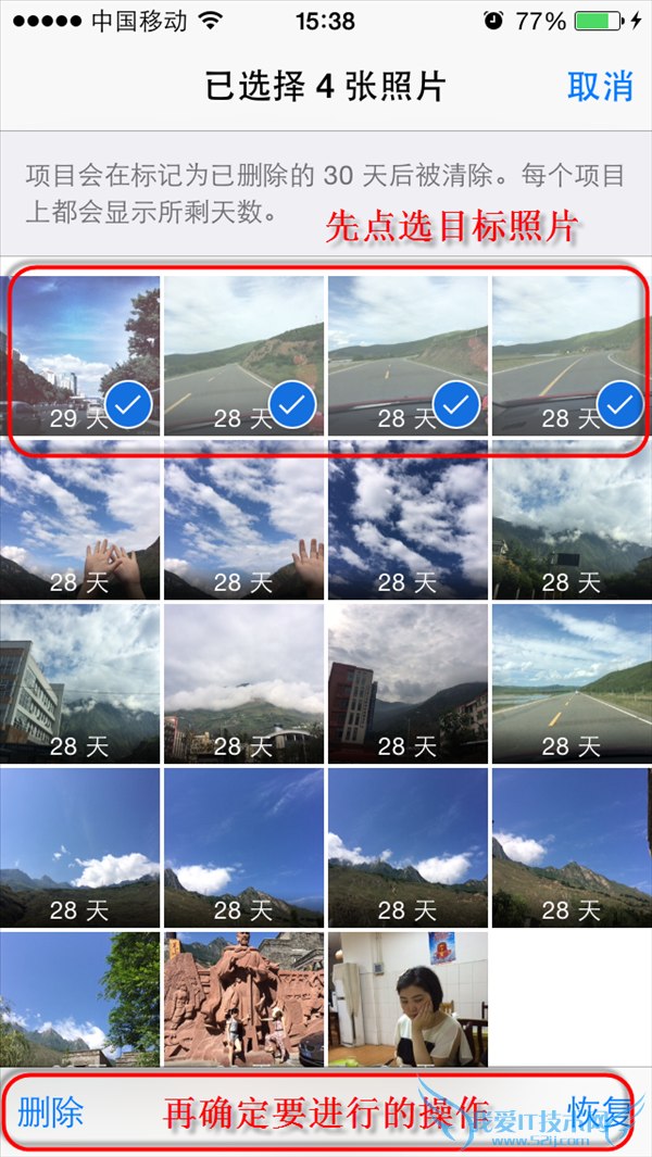步骤3:如果只是希望彻底删除某几张、或是要恢复某几张照片,在选择状态下分别点击要删除或恢复的照片,再点界面最下方的相应选项即可。