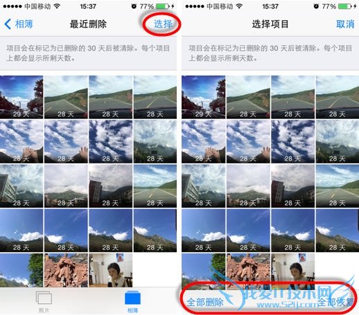 步骤2:点击进入该相薄分类后,点右上方的“选择”后可以实现全部删除或全部恢复。