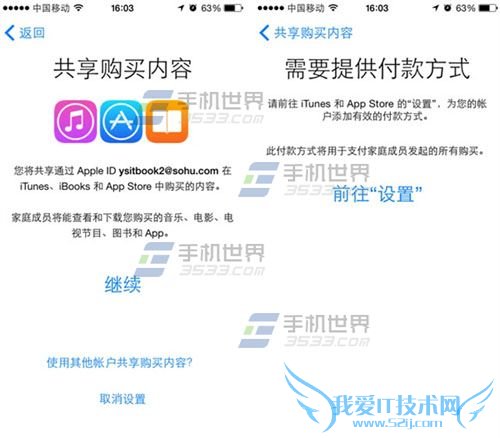 2)点击【继续】,如提示【需要提供付款方式】的话,请【前往设置】绑定一张银行卡。PS:在中国App Store还不能绑定信用卡,所以购买共享还不能用。(如下图)