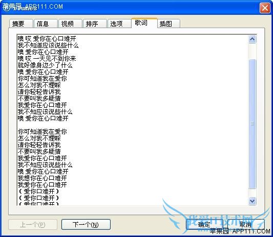 第二步,在弹出的窗口中,点击歌词选项,然后将网络上搜索到的该歌曲歌词填入,点击确定。
