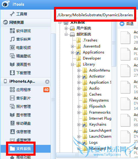 方法二:如果您的设备无限重启或出现白苹果状态,可尝试用电脑连接设备使用iTools进行操作,如果设备能被识别,进入文件系统,依次打开Library/MobileSubstrate/DynamicLibraries,找到里面与Subtlelock有关的两个文件删掉,再强制重启就可以了。