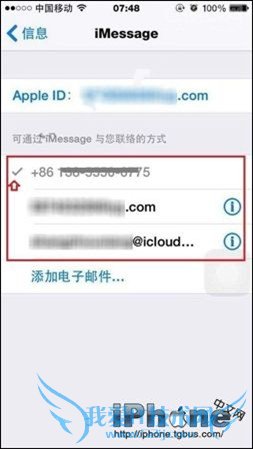 第二步:在“可通过iMessage与您联络方式”仅勾选手机号码,其他任何邮箱都取消勾选即可,如下图所示。