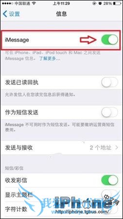 第一步:首先必须开启【iMessage】,然后进入信息设置中的【发送与接收】设置,如下图所示。