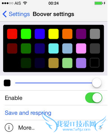 打开「colors」,可以设定颜色(以RGB为设定单位),下方可以设定为以App 色调各自搭配颜色。同样记得「Save and Respring」。