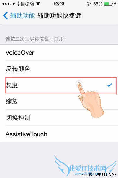 第二步,在“辅助功能快捷键”页面,勾选“灰度”选项,即可利用“连按三次主屏幕按钮”的方法,快速打开或者关闭灰度显示。