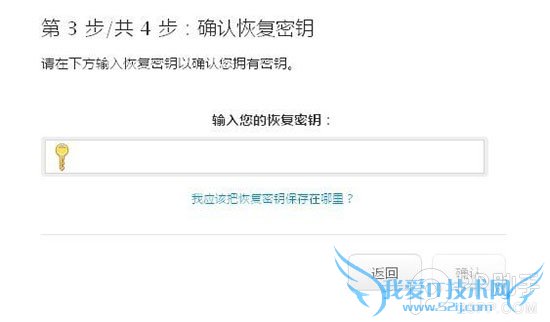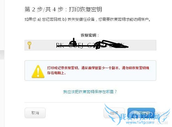 7. 设备验证成功之后,我们会得到一个非常非常重要的恢复密钥,最好将它抄录在一个或者几个不会丢失的本子上,留着以后备用。然后,系统将会要求我们输入恢复密钥以确认我们已经拥有了密钥。