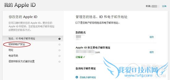 3. 点击左侧的“密码和账户安全”选项,并回答此前设置的安全提示问题,开始两步验证的设置。