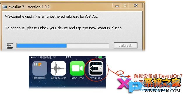【evasi0n 7】工具界面上提示:请解锁设备屏幕,并点击桌面上的【evasi0n 7】图标,以继续越狱过程。