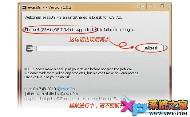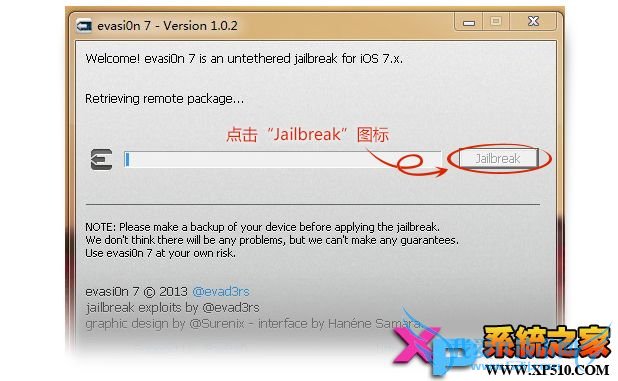 第四步:点击【Jaibreak】— 等待【evasi0n 7】工具运行,期间设备会重启