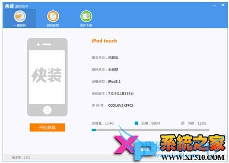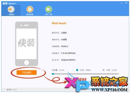 第二步:快装越狱助手识别iOS 设备后点击【开始越狱】