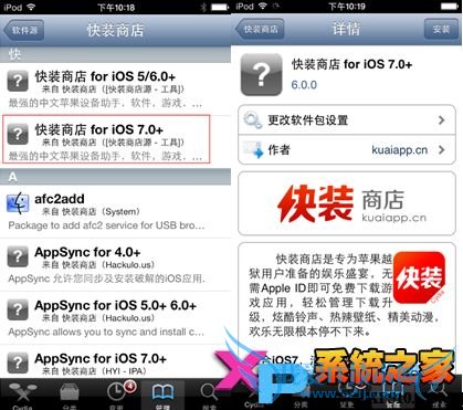 但是现在您还缺少越狱设备运行所必须的补丁,如AFC(Apple File Connection)和Appsync。推荐您通过Cydia安装“快装商店 for iOS 7.0+”,将自动安装所需补丁(如果您希望逐一安装,可以在Cydia中的快装商店源里单独安装这两个补丁)。
