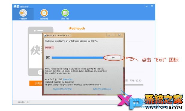 第五步:越狱完成【evasi0n 7】界面提示:【Done!】,点击Exit继续。