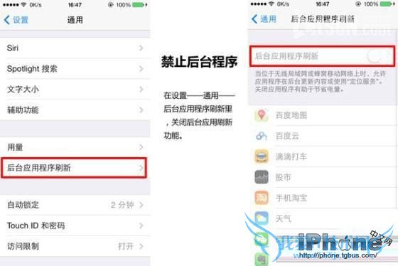 方法:在设置——通用——后台应用程序刷新里,关闭后台应用刷新功能。