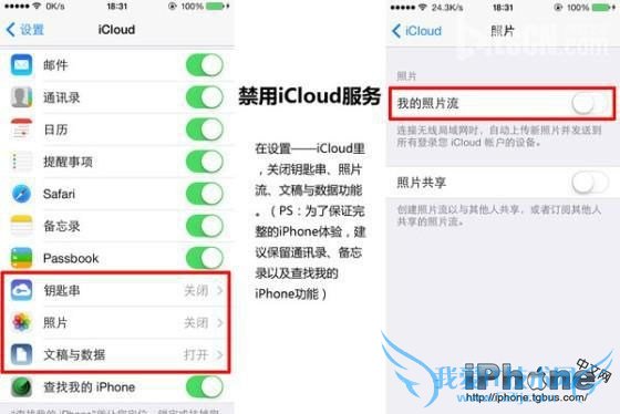 方法:在设置——iCloud里,关闭钥匙串、照片流、文稿与数据功能。(PS:为了保证完整的iPhone体验,建议保留通讯录、备忘录以及查找我的iPhone功能)