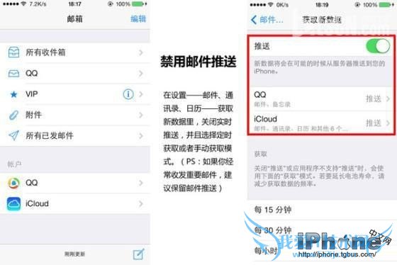 法:在设置——邮件、通讯录、日历——获取新数据里,关闭实时推送,并且选择定时获取或者手动获取模式。(PS:如果你经常收发重要邮件,推荐保留推送)