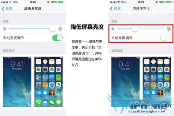 方法:在设置——墙纸与亮度里,关闭手机“自动亮度调节”,并将屏幕亮度恒定在40%左右。既可以满足绝大多数的使用情况,最主要是能够明显控制iPhone掉电速度。