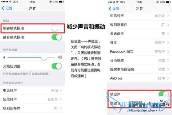 方法:在设置——声音里,关闭“响铃模式振动”,关闭按键音和锁定音。(PS:推荐保留静音模式振动,否则有可能错过重要电话或通知)
