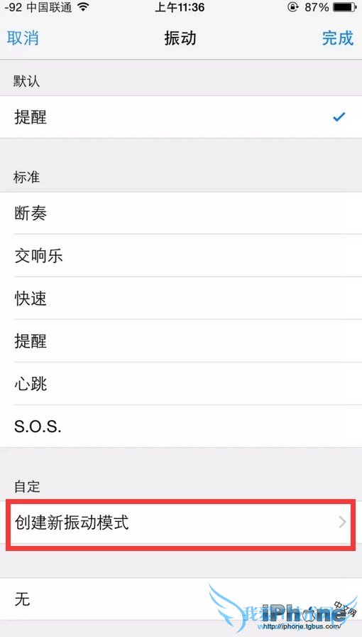 点击振动,在这里我们可以选择预置的振动模式,或者自定义——创建新的振动模式,这里就是你发挥创意的地方了。