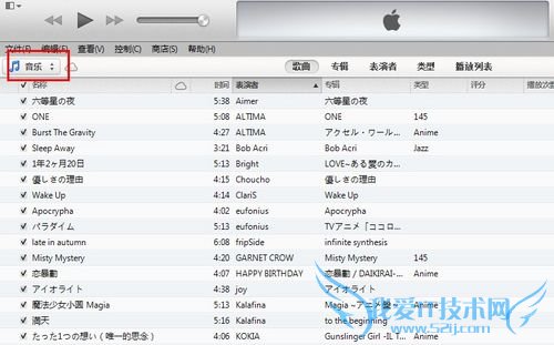 2.打开iTunes,当成功识别出iPhone后,请点击iTunes界面左上角栏目中的“音乐”,那么此时界面右侧则会显示iTunes音乐资料库里的所有已导入的音乐。这里的导入意思是将本机上的音乐文件导入进iTunes的音乐资料库里。