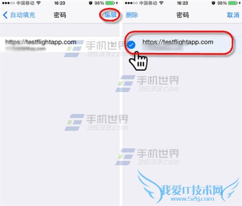 步骤3:进入“密码”页面,点击右上角“编辑”按钮;然后再点选要删除的网站密码项,点左上角“删除”按钮,最后确认删除即可。